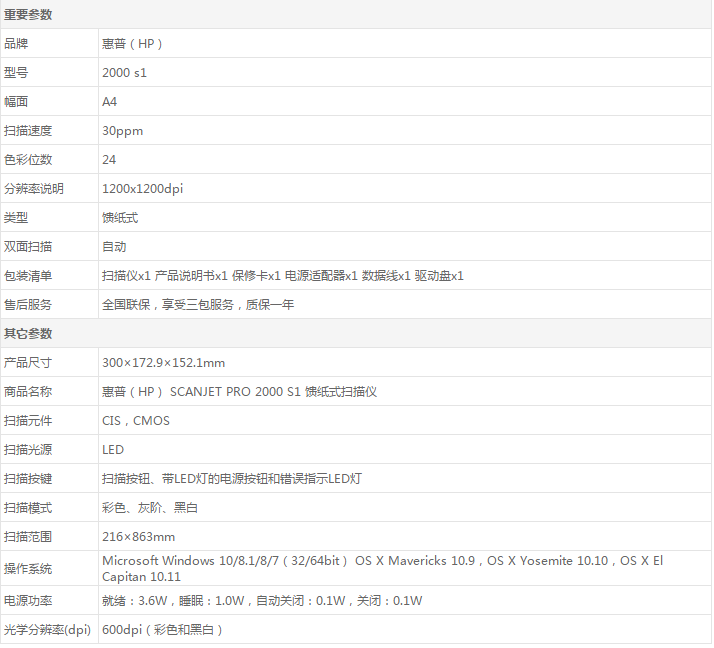 惠普(HP) SCANJET PRO 2000 S1 馈纸式扫描仪