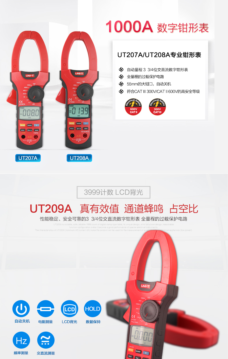 优利德1000A钳形表数字万用表高精度电流表 UT209A G20160976