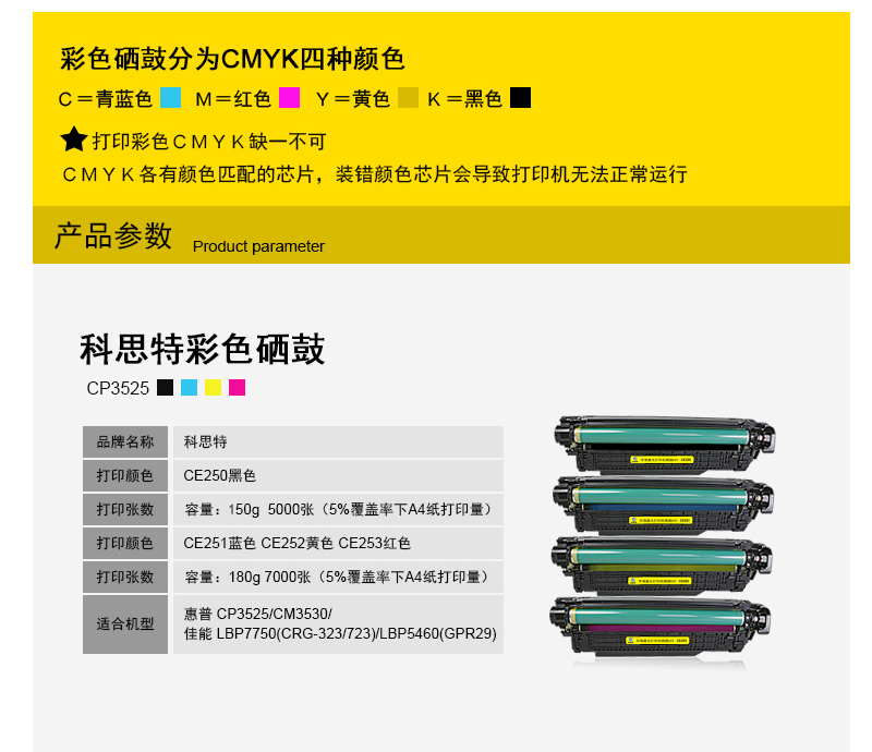 科思特CE252A硒鼓 适用惠普 CP3525 CM3530 LBP7750 黄色 专业版