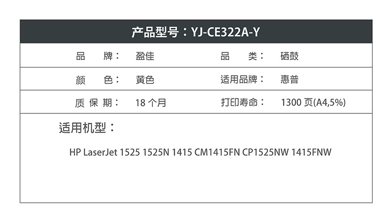 当前位置:首页 > 办公用品-硒鼓、粉盒-鼓粉盒 > 盈佳YJ CE322A(128A)黄鼓(带芯片)适用于惠普HP LaserJet 1525 1525N 1415 CM1415FN CP1525NW 1415FNW