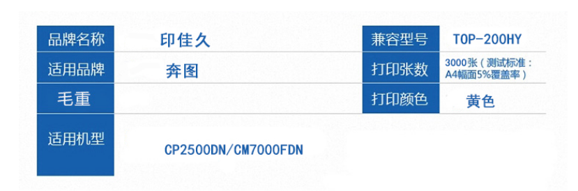 当前位置:首页 > 办公用品-硒鼓、粉盒-墨粉盒 > 印佳久TOP-200HY 黄色碳粉 适用CP2500DN/CM7000FDN